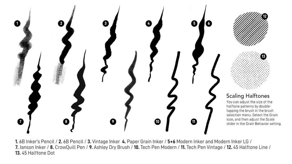- The brush set includes a collection of 4-high resolution vintage paper textures, a PDF brush guide, license agreement, free lifetime updates, and the following brushes.